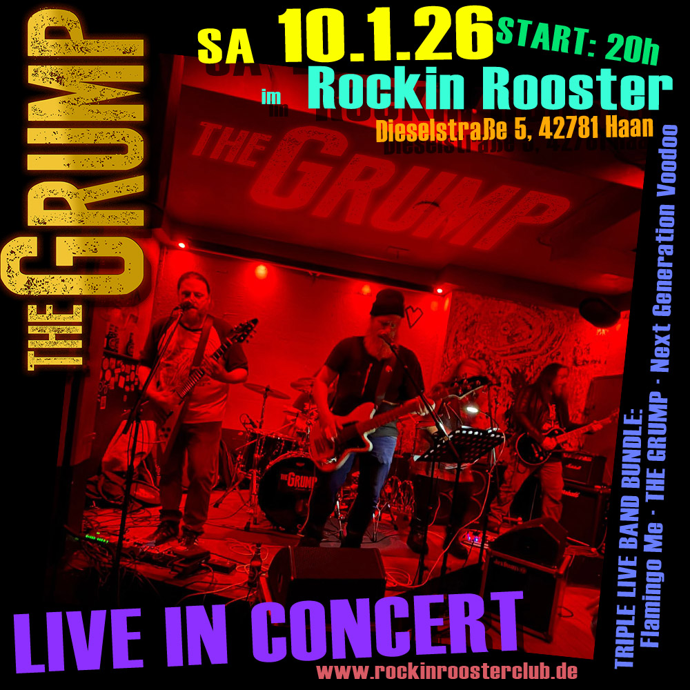 Next Live Dates: ***coming soon*** Last Live Dates: SAMSTAG 10.1.26 im ROCKIN ROOSTER [HAAN] *NEU* » Tickets hier Online kaufen Last Live Dates: » SATURDAY 7.6.25 » GROOVE BAR COLOGNE BATTLE OF THE BANDS Das „Battle of the Bands“ in der Groove Bar! Drei Bands an einem Abend! Mit THE SIXSTERS (Alternative Rock, Essen) – RADIOGEIST (Heavy Rock, Bonn/D’dorf/London) – THE GRUMP (Classic Rock, Köln) GROOVE BAR – www.groove.barFrankfurter Str. 200, 51147 Köln Spotify: https://open.spotify.com/intl-de/album/5TMsBHfD5yEubcvPHhO9PP Amazon:https://smile.amazon.de/Firewater-Music-Grump/dp/B08BXNJ6XW Merchandizing:https://thegrump.myspreadshop.de BackStagePro: https://www.backstagepro.de/thegrump Instagram: https://www.instagram.com/thegrumpmusic Tickets: » für die aktuell anstehenden Konzerte gibt es Tickets nur an der Abendkasse. The Grump Band – live @ Soniuc Ballroom 2023 Questions? Suggestions? Press Infos? Concert request? Whatever? Mail to: mail@thegrump.de